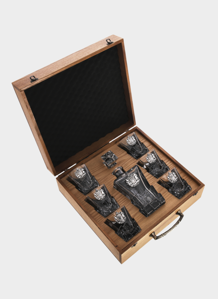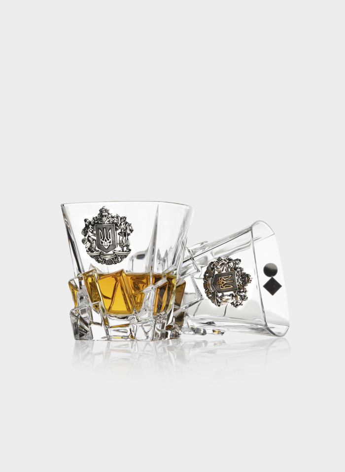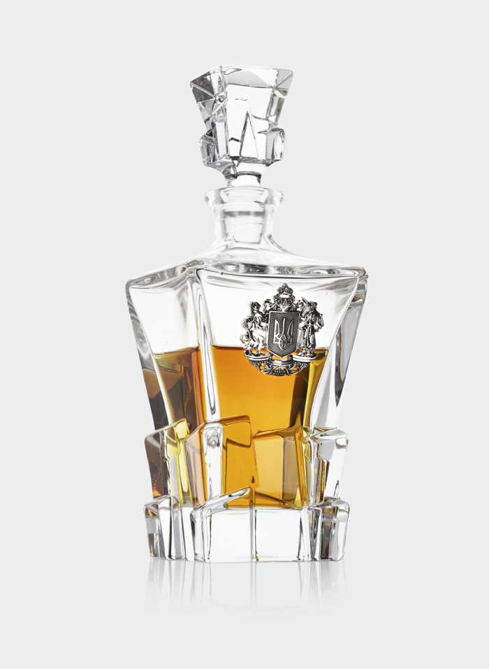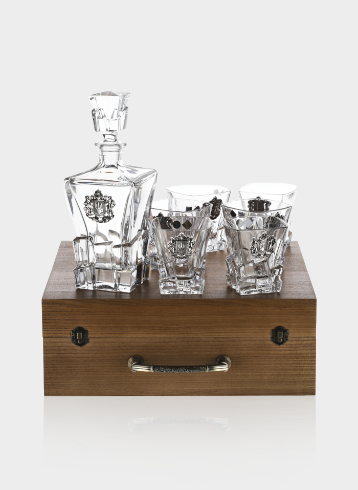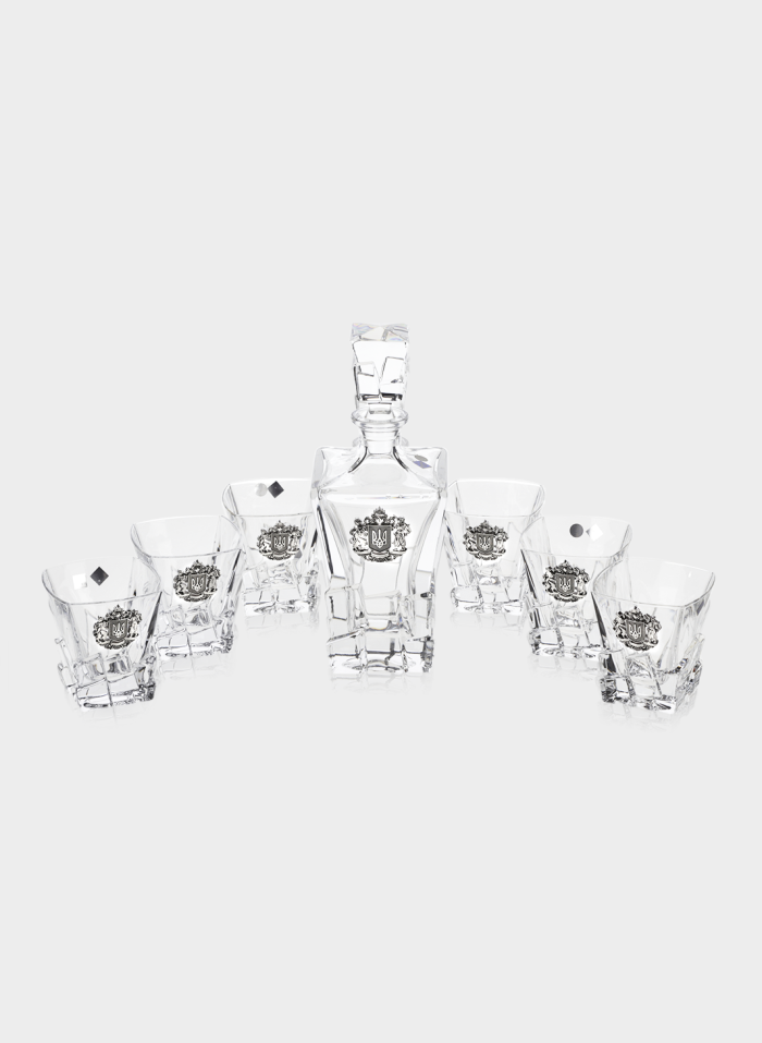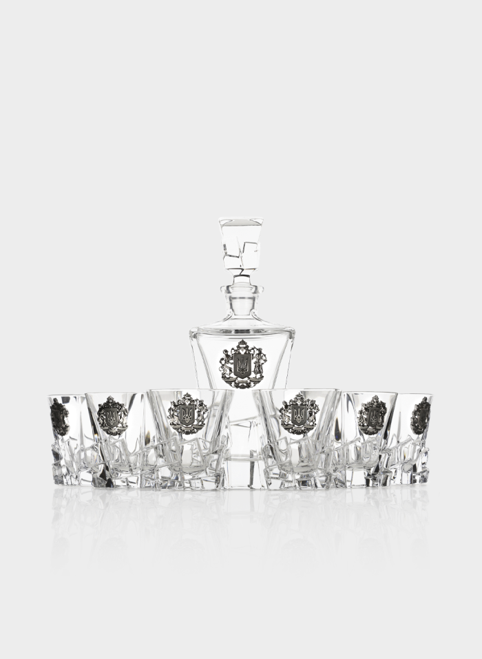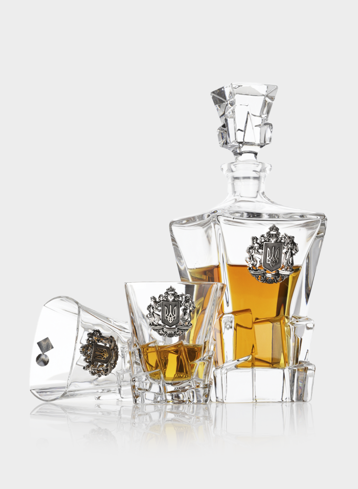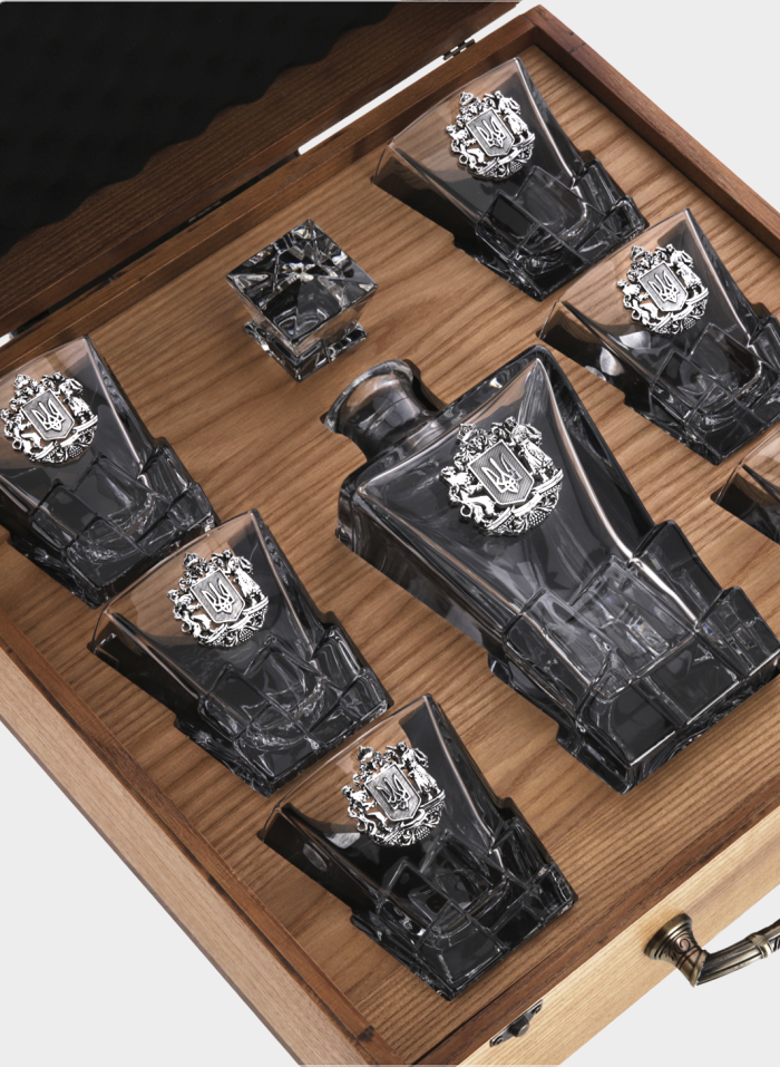 Вишуканий кришталевий набір, створений для цінителів класики та елегантності. До комплекту входить графин оригінальної форми та чотири склянки, прикрашені металевим гербом України. Прозорий кришталь із виразними гранями красиво відбиває світло, підкреслюючи розкіш і статус виробу.