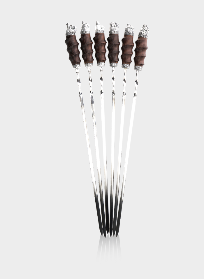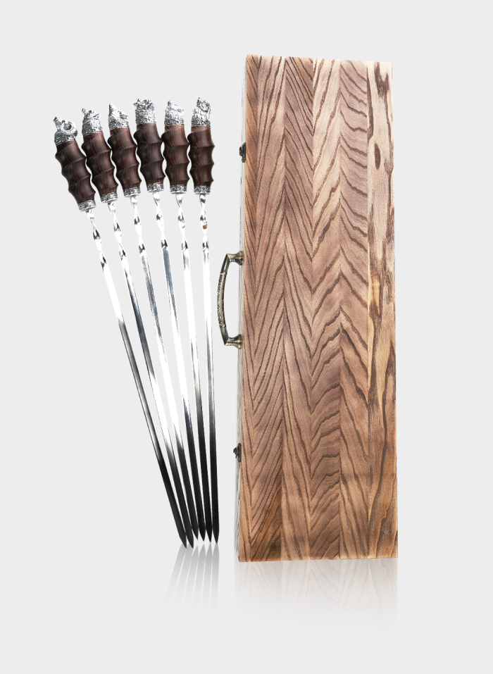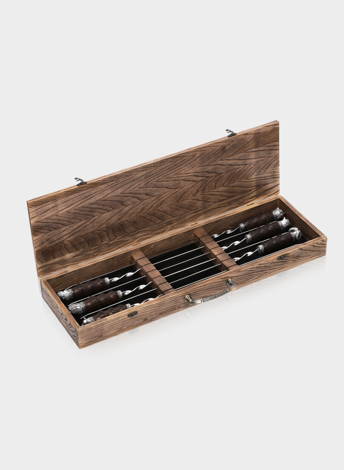 Преміальний набір шампурів, створений для поціновувачів вишуканих деталей та традицій. Леза прикрашені срібними елементами з тонким ручним оздобленням, що підкреслює статусність та унікальність виробу.