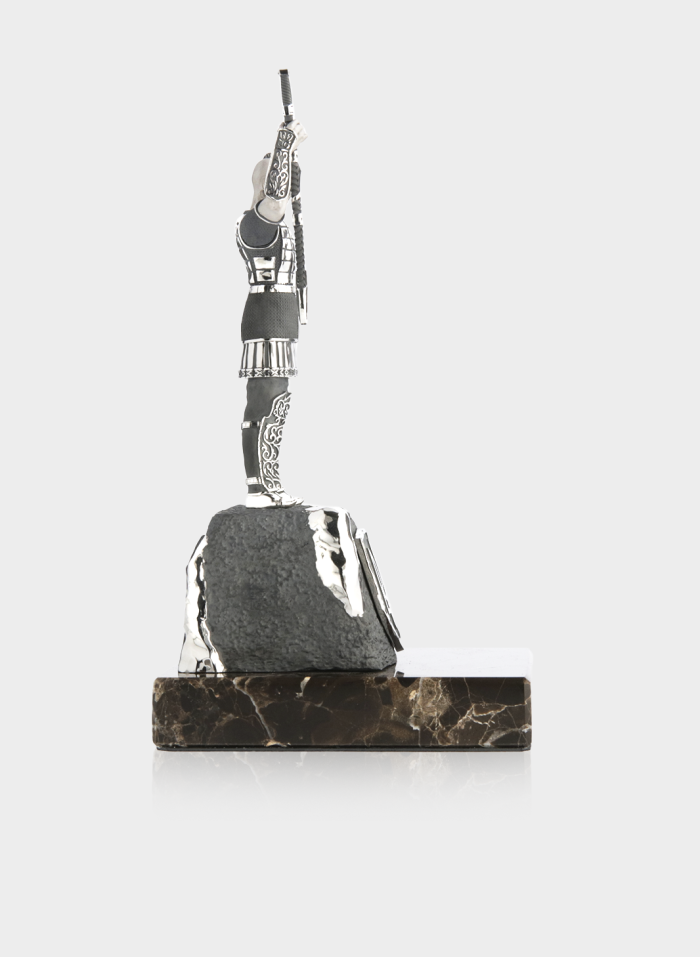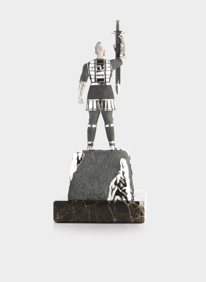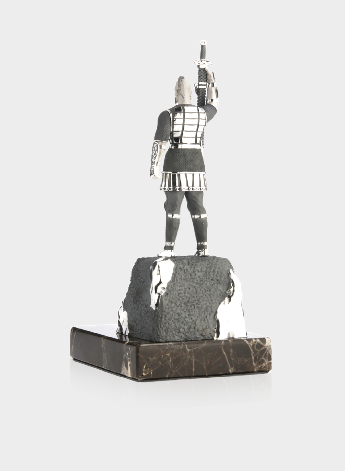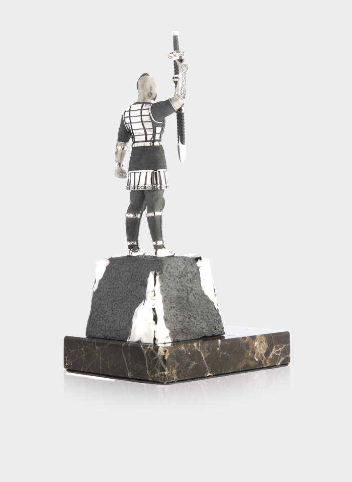 Монументальний витвір, що втілює силу духу та героїзм легендарного князя і символізує непохитність української нації. Статуетка виконана зі срібла з ювелірною точністю: кожна деталь обладунку, меча та орнаментів підкреслює велич і рішучість постаті.