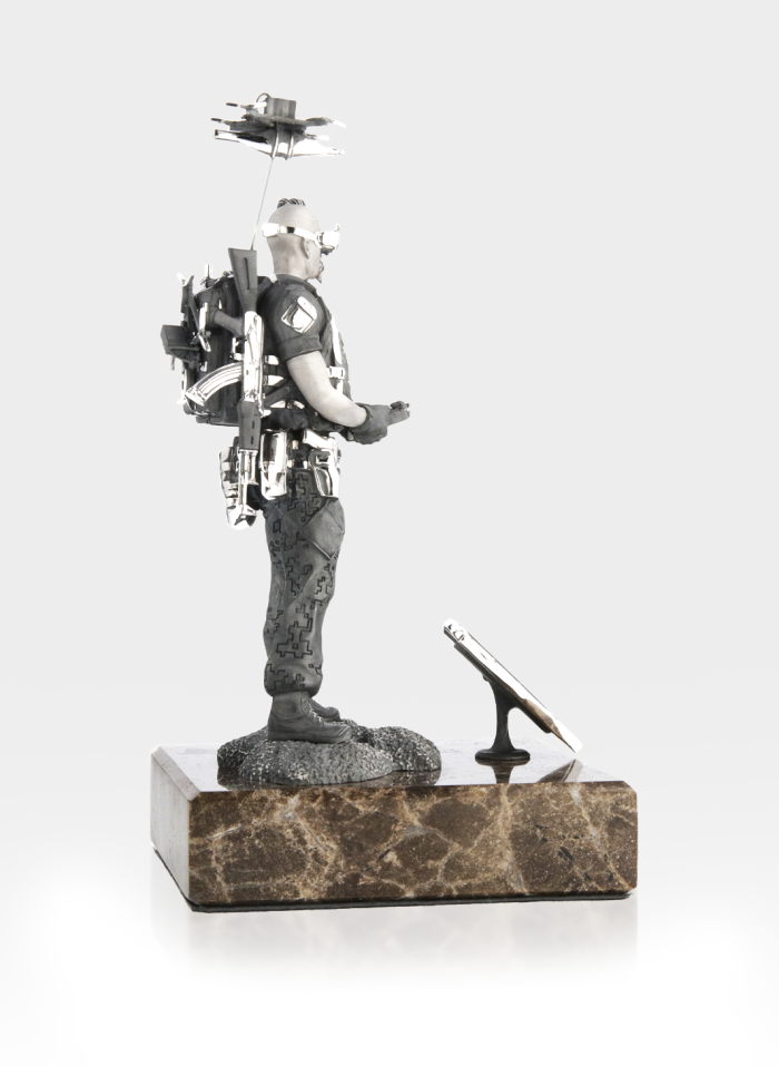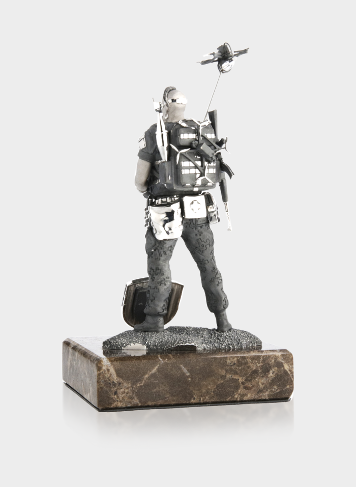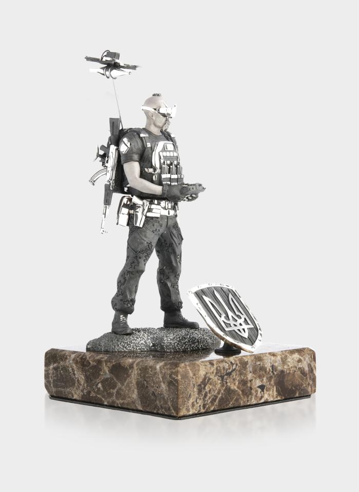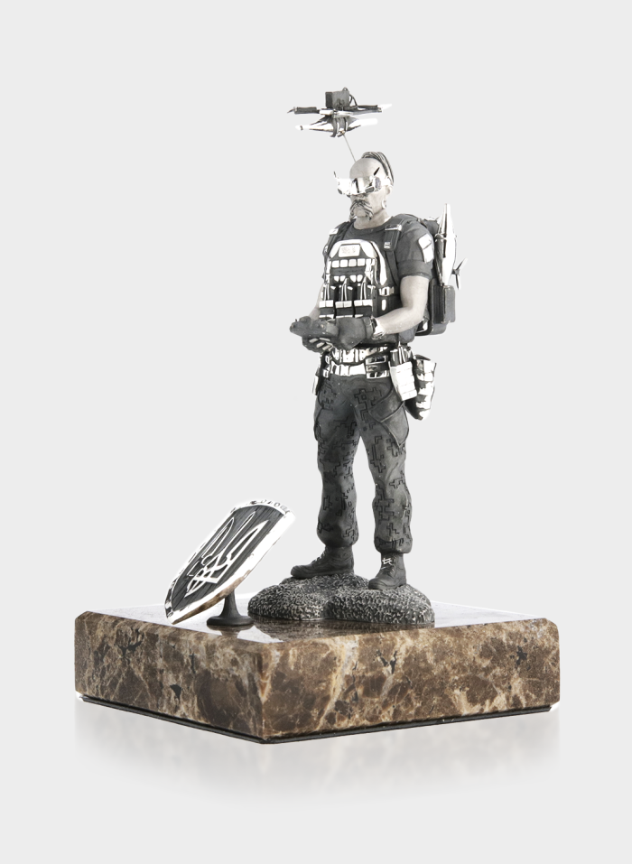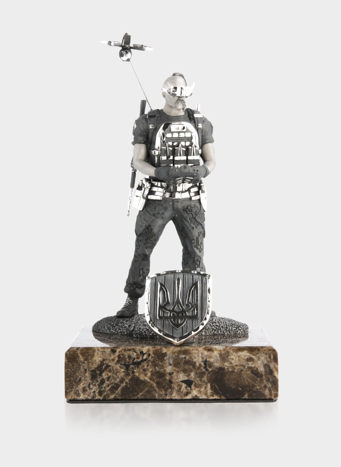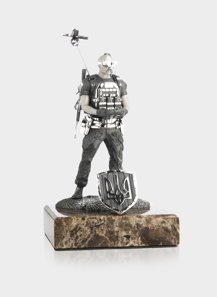 Срібна статуетка «Козак з FPV» на мармуровому постаменті