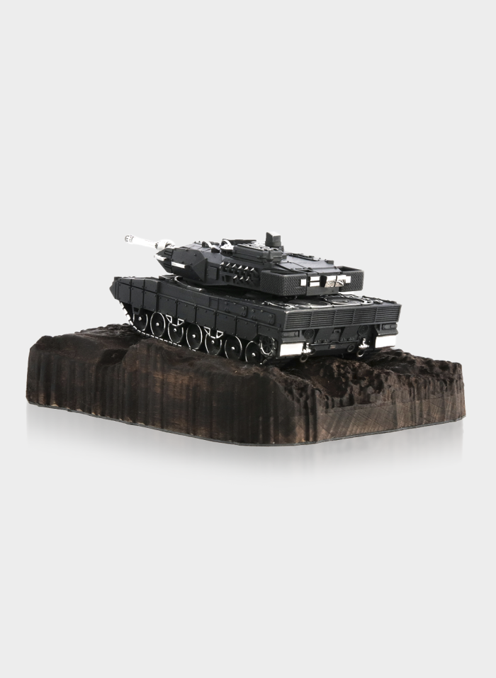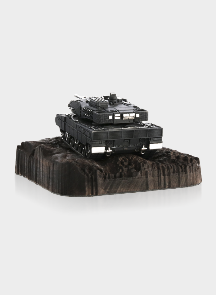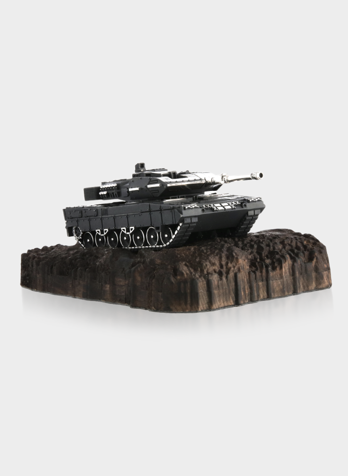 Срібна статуетка «Танк Leopard» на дерев’яному постаменті — символ сучасної бойової могутності та технологічної переваги. Витончено відтворені деталі корпусу, башти та гусениць демонструють ювелірну майстерність і точність виконання. Контраст срібла та темного дерева створює відчуття сили й монументальності.
